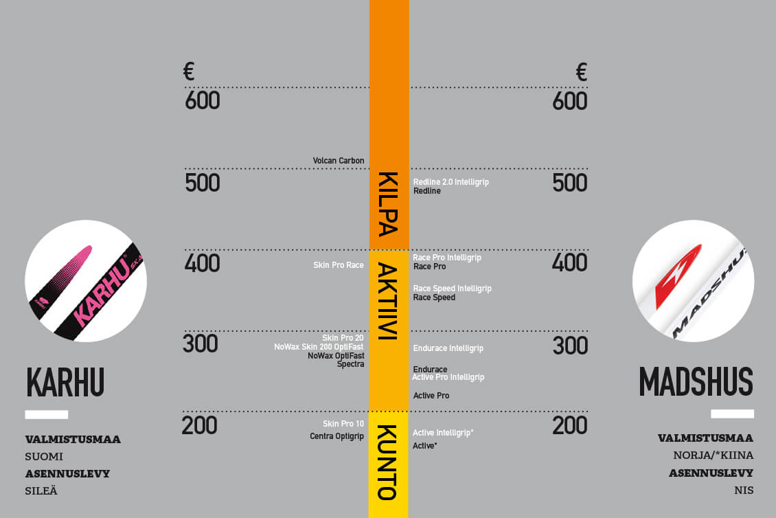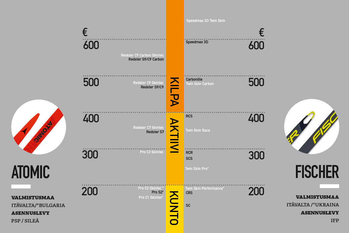 Näillä lähes olemattoman painoisilla mutta kiertojäykillä hiilikuitusuksilla hiihdetään toki kilpaa, mutta aktiivihiihtäjä saa kilpasuksen keskeisimmät ominaisuudet edelleen noin 400 euron hintaluokasta.
