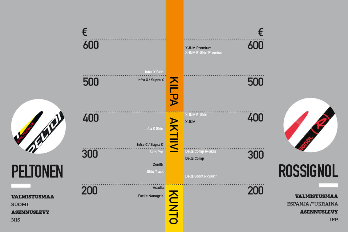 300 eurolla saa jo hyvin hiihdettävän skinisuksen. Tähän hintapisteeseen osuu Peltosen menestysmalli [03] SkinPro, josta löytyy runsaasti erilaisia jäykkyyksiä. Yhden suksen liu’ussa tällainen suksi on jo selvästi liukkaampi. Pidon saavuttamiseksi se vaatii painonsiirtoa, muttei teknisesti täydellistä potkua.