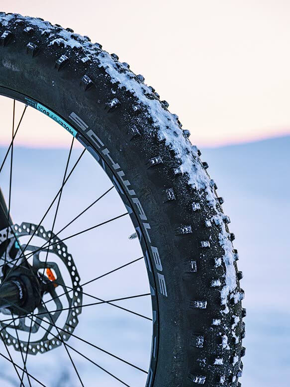 [07] Renkaat. Leveä fättirengas kantaa pehmeälläkin alustalla. Ulkolämpötila ja polun pehmeys vaikuttavat rengaspaineisiin, joten pumppu mukaan. Eteläisen Suomen jäisillä poluilla nastarenkaat lisäävät ajoturvallisuutta.