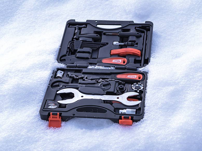 [06] Huolto ja korjaus. Huolletulla pyörällä talviajokin on mukavaa. Tarkista jo ennen maastoon lähtöä ainakin jarrujen ja vaihteiden toimivuus, sillä pakkasessa ja pimeässä korjaustoimet ovat hankalia. Työkalut ja varaosat repussa ovat sitä tärkeämpiä, mitä kauemmas asutuksesta pyöräilet.