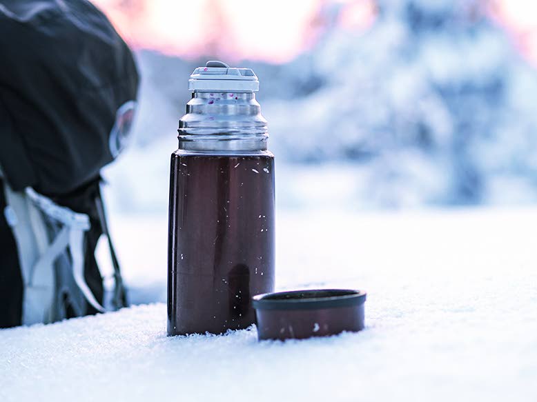 [03] Reppu selkään. Talviretkellä tarvitaan hyvät eväät ja varavaatetta. Lumessa polkeminen kuluttaa energiaa ja sää voi muuttaa suunnitelmia. Termospullossa juoma pysyy lämpimänä pakkasessakin. Maastotauoilla maistuvat voileivät ja energiapatukat. Taukotakki on talviretkillä välttämätön mukavuus- ja turvallisuusvaruste. EA-pussukan ohella tärkeitä talvivarusteita ovat mm. avaruuslakana ja kädenlämmittimet.