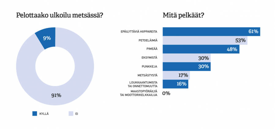 Epäilyttävien hiippareiden, petoeläinten ja pimeän lisäksi tutkimuksessa selvitettiin, pelottaako eksyminen, punkit, metsästys. loukkaantuminen, maastopyöräily tai moottorikelkkailu.