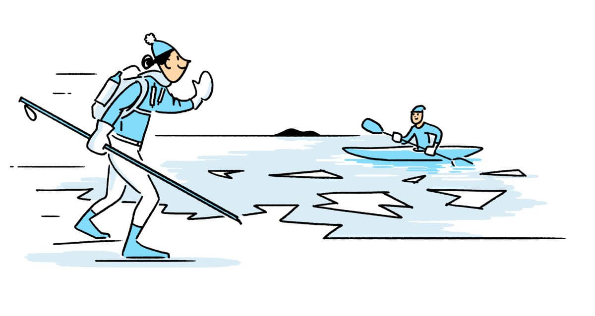 Lajeja onkin siis kaksi, eikä hän suostu laittamaan niitä edes tärkeysjärjestykseen. Hänen ei tarvitse, sillä melonta ja retkiluistelu eivät kilpaile keskenään. Olosuhteet sulkevat pois aina toisen.