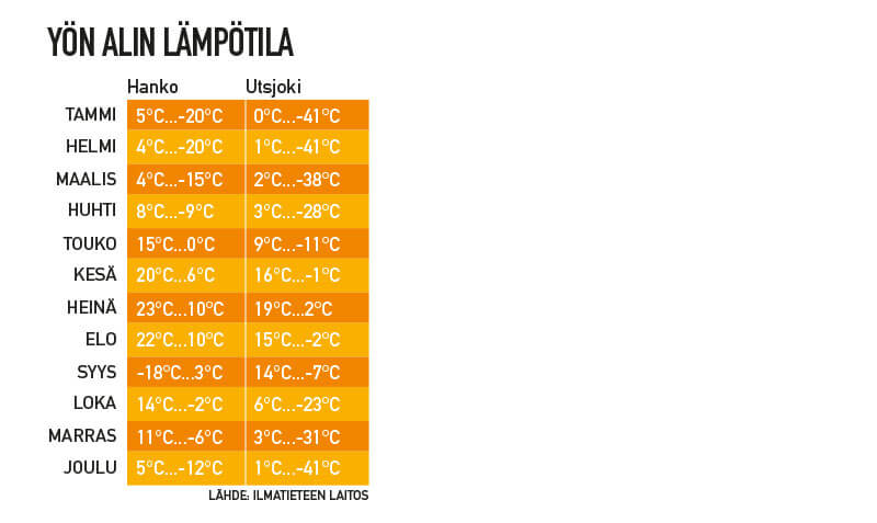 Suomi on pitkä maa, minkä lisäksi lämpötiloihin vaikuttavat suuret vuosittaiset vaihtelut. Yksittäisen retken kohdalla kannattaa keskiarvojen ja äärilämpötilojen sijaan katsoa sääennustetta. Oheisesta taulukosta näkee minkälaisiin yölämpötiloihin eri vuodenaikoina on syytä varautua. Taulukossa on esitetty vuorokauden alimman lämpötilan vaihteluväli kuukausittain viimeisen 10 vuoden vertailujaksolla. Tiedot on kerätty Ilmatieteen laitoksen Hangon Tulliniemen ja Utsjoen Kevojärven havaintoasemilta.