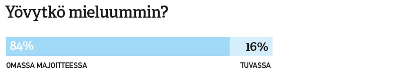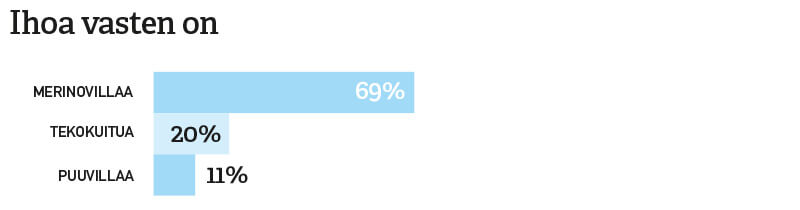 Kesän tunturivaelluksella vaelluskenkä on ylivoimaisesti suosituin jalkine. Vaatepuolella peräti 69 % valitsi iholleen merinovillaa, joka on selvästi syrjäyttänyt perinteiset tekokuitukerrastot. Vieläkin perinteisempään puuvillaan luottaa joka kymmenes vaeltaja.