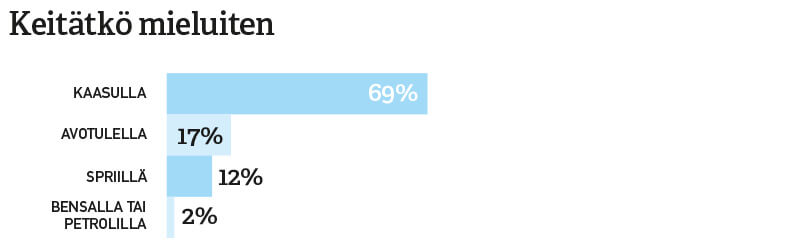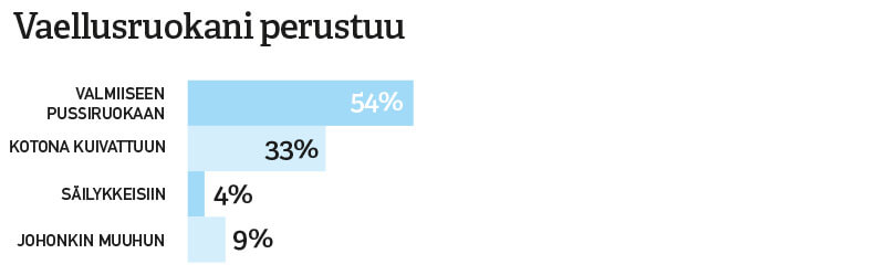 Ateriansa ylivoimainen enemmistö valmistaa kaasukeittimellä. Joka kolmas kuivaa vaellusruokansa itse.