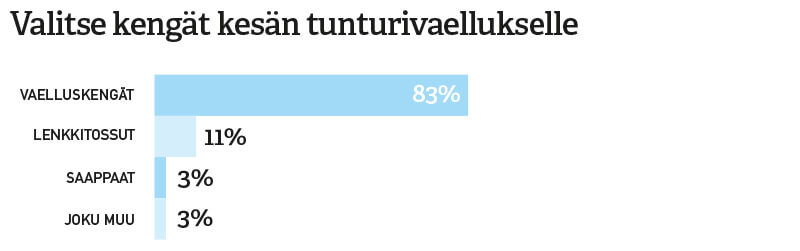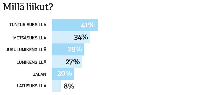 Suosituimmiksi välineiksi osoittautuivat tunturisukset. Ehkäpä yllättävin oli lyhyessä ajassa suosiotaan kasvattaneiden liukulumikenkien osuus. Lyhyillä ja leveillä karvapohjasuksilla kertoo vaeltavansa peräti 29 % vastaajista.