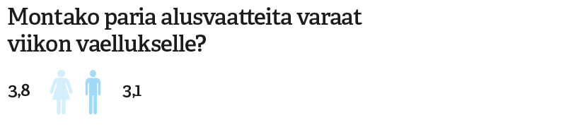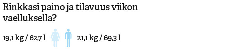 Viikon vaelluksella naisten rinkka painaa 19,1 kilogrammaa, miesten 21,1. Tilavuudeltaan ne ovat keskimäärin 62,7- ja 69,3-litraisia.
