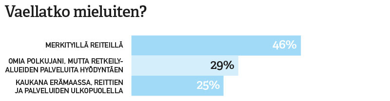 Noin puolet vaeltajista pysyttelee mieluiten merkityillä reiteillä, kun taas omaan rauhaansa, reittien ja palveluiden ulkopuolelle, hakeutuu joka neljäs.