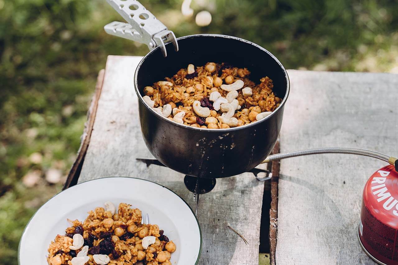Vaelluksella Kaada riisipussin sisältö kattilaan ja lisää sen verran vettä, että ainekset peittyvät. Keitä kypsäksi. Lisää lopuksi joukkoon loraus öljyä ja cashew-karpalosekoitus ja paista hetki.