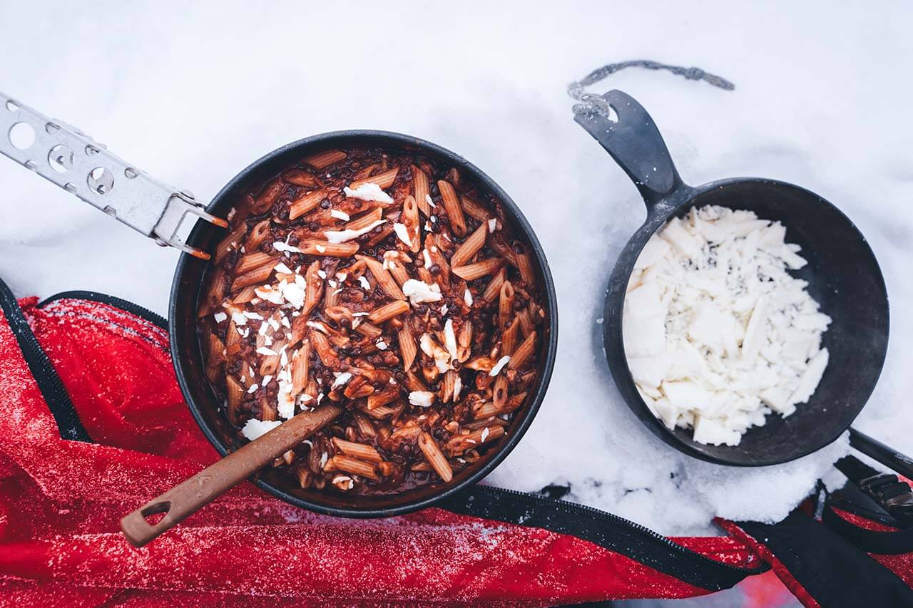 Vaelluksella Kaada pussin sisältö: pasta ja kuivattu kastike kattilaan ja lisää vettä niin että raaka-aineet peittyvät. Keitä kypsäksi. Lisää halutessasi vegeparmesaanista siivuja annoksen päälle.