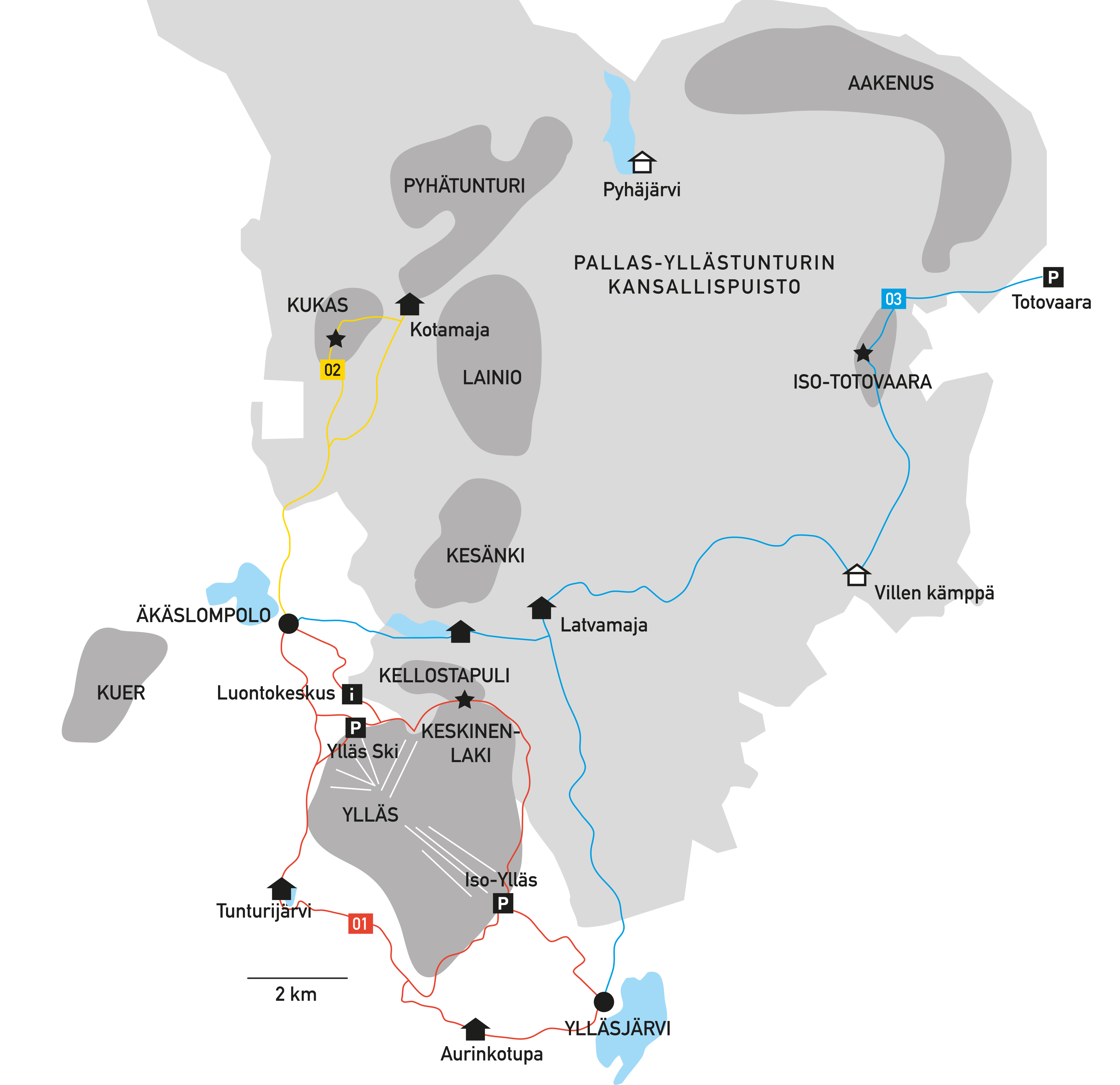 Totovaarasta Äkäslompoloon tulee matkaa noin 25 kilometriä, Ylläsjärvelle kolmisenkymmentä. Kovakuntoisimmat voivat kiertää Aakenuksen ja seikkailunhaluisimmat tunturihiihtäjät sen huippujen kautta kulkevan erämaaladun Pyhäjärvelle.