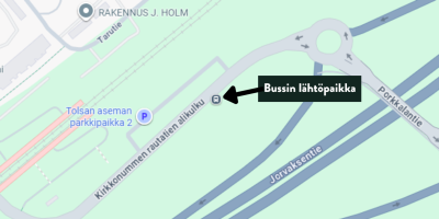 Tolsan juna-asema: Tolsantie 14, 02400 Kirkkonummi. Pysäkkitunnus: Ki0441 Tolsan juna-asemalla on myös parkkitilaa, mutta suositelemme autoilijoita viemään autot Peuramaan laskettelukeskukselle.