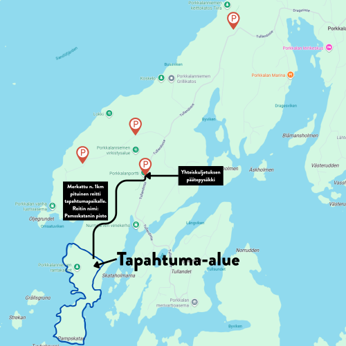 Tapahtumapaikan lähin osoite: Tullandintie 187, 02480 Kirkkonummi, parkkipaikalta on opastus tapahtumapaikalle ja kävelymatka on polkuja pitkin noin 1 km.