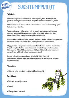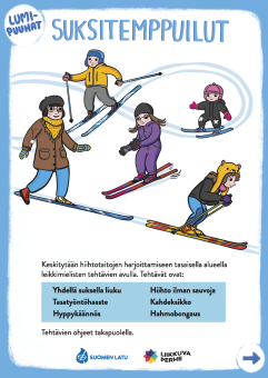 Lumi on mitä mainioin liikuttaja ja luovuuden lähde. Koko perheen lumipuuhakorttien tavoitteena on innostaa kaikenikäiset nauttimaan talvesta yhdessä liikkuen. Kortteja voi käyttää luovasti yksittäisinä tehtävinä tai esimerkiksi sarjana tai ratana. Tehtäviin on haluttu tuoda runsaasti vaihtoehtoja, jolloin myös järjestäjällä on vastuu päättää, mitä tehdään.