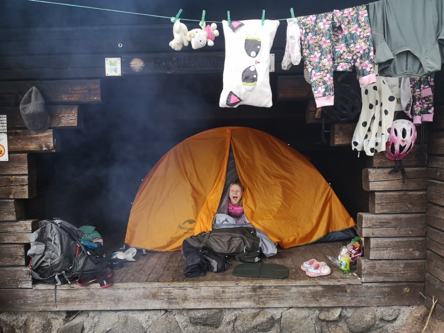 “Viisivuotiaan tyttäreni riemu teltassa nukkumisen vuoksi. Hän sanoi, että nukkuu tästä lähtien joka yön teltassa. Seikkailimme Pukalan virkistysmetsässä. Ensin maastopyöräilimme kuusi kilometriä erittäin mäkistä maastoa ja saimme useita vesikuuroja niskaamme. Sitkeä pikkuinen jaksoi polkea, vaikka hyttysetkin kiusasivat. Viimeinen kilometri piti tunkata eli taluttaa pyörää vaikean juurakkoisen maaston takia. Sitä suurempi ilo oli, kun vihdoin saavuimme Roninlaavulle. Nuotiossa oli vielä hiillos jäljellä ja saatiin nopeasti tulet syttymään, makkarat paistumaan ja kamat kuivumaan. Tyttären mielestä päivä oli paras päivä ikinä”, kertoo Salonen kuvan taustoista.