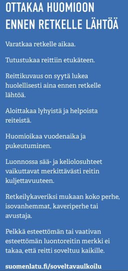 Tuttuun retkikohteeseen voi lähteä ex tempore, kun taas uuteen retkikohteeseen on hyvä tutustua ennakkoon ja suunnitella retki hyvin. Helppokulkuisia ja esteettömiä retkikohteita, jotka soveltuvat myös lapsiperheille vaunujen kanssa, apuvälineillä liikkuville tai helppoja reittejä hakeville löytyy ympäri Suomen.