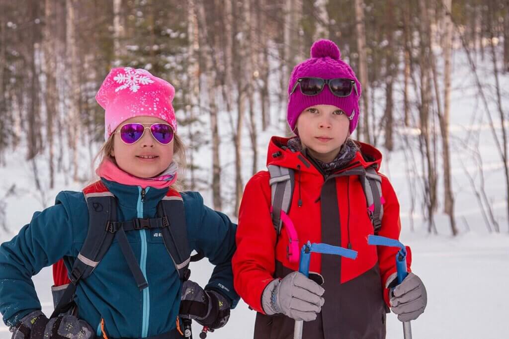 Kevättalvella aurinkolasit suojaavat lumisokeudelta.