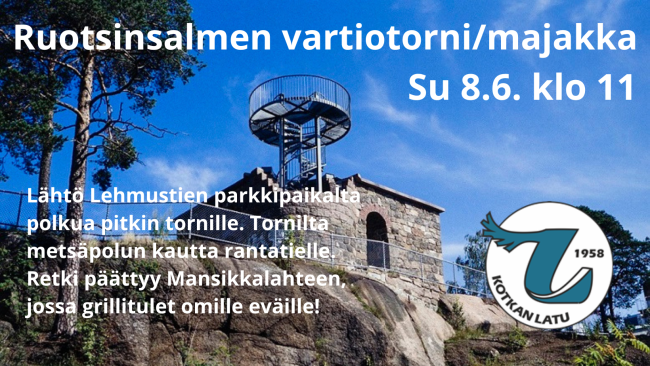 Ruotsinsalmen tähystys- ja vartiotorni odottaa meitä! Kuljemme kallioita pitkin entiselle Ruotsinsalmen majakalle ja kiipeämme ylös torniin. Lopuksi 'rantaudumme' Mansikkalahteen evästelemään grillitulen äärelle.