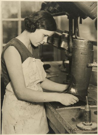 Kumisaappaiden valmistusta Suomen Gummitehdas Oy:n Nokian tehtaalla. Kuva: Pietinen, Aarne, 1933. Museovirasto