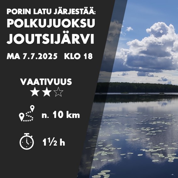 Porin Ladun polkujuoksu maanantaina 7. heinäkuuta 2025 juostaan Joutsijärvellä. Kokoontuminen klo 18 Tammen leirikeskuksen viereiselle parkkipaikalle, Tammentien päässä (Google Maps: Vasoniementie 15). Noin 10 km matkalla seikkaillaan Joutsijärven etelärannoilla. Ei ennakkoilmoittautumista, eikä osallistumismaksua.