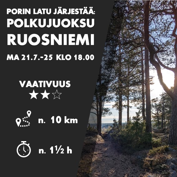 Porin Ladun n. 10 km polkujuoksu juostaan Ruosniemessä maanantaina 21.7.2025 klo 18 alkaen. Tutustutaan samalla myös Ruosniemen uusiin kuntoportaisiin. Kokoontuminen hiihtokeskuksen parkkipaikalla. Ei ennakkoilmoittautumista, eikä osallistumismaksua.