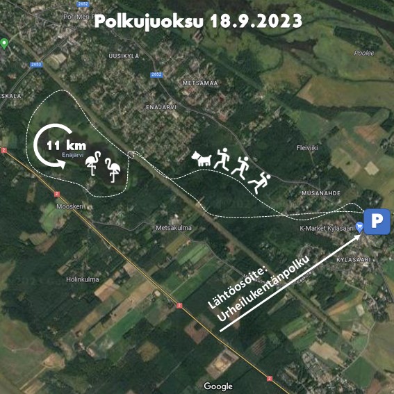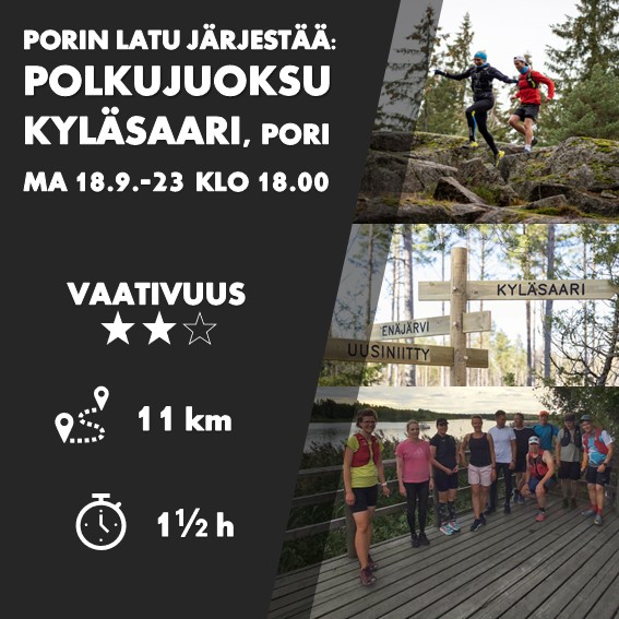 Porin Ladun polkujuoksu maanantaina 18. syyskuuta 2023 starttaa Kyläsaaren Urheilukentältä. Kokoontuminen kentän parkkipaikalla, (navigointiosoite: Urheilukentänpolku). Juostaan pääosin metsäpolkuja Enäjärven ympäri ja palataan takaisin lähtöpaikkaan. Lenkkimatka 11 km. Ei ennakkoilmoittautumista.