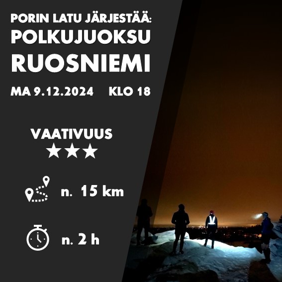 Rankkasateiden ja tulvien vuoksi peruttu lenkki juostaan maanantaina 9.12.2024. Raastavaa riemua ja raikasta reippailua luvassa Ruosniemessä klo 18 alkaen, kun Porin Ladun n. 15 km polkusuojsulenkki starttaa hiihtokeskuksen parkkipaikalta. Tällä kerralla vähän pidempi juoksu pimeydessä, joten nestettä on hyvä varata mukaan, sekä mahdollisuuksien mukaan varalle myös toinen valaisin. Pimeässä ja mäkisessä maastossa juostaan parin tunnin lenkki vaativassa maastossa. Lenkki ei sovellu vasta-alkajille. Ei ennakkoilmoittautumista, eikä osallistumismaksua.