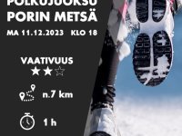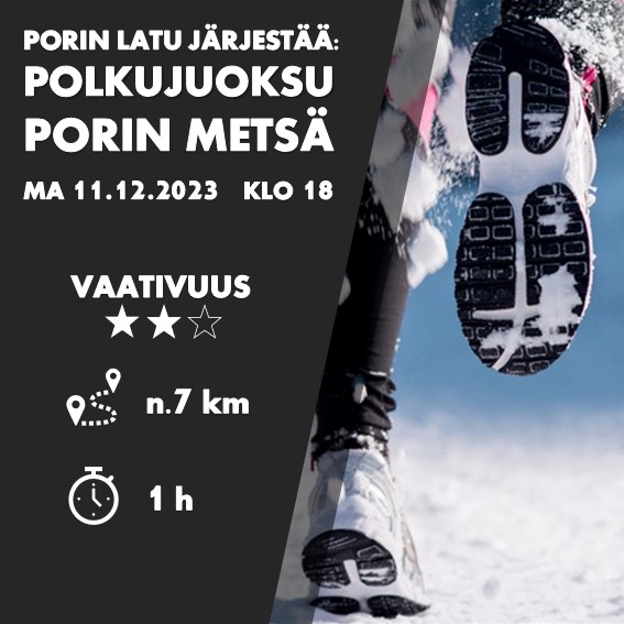 Porin Ladun vuoden viimeinen polkujuoksu Porin Metsässä maanantaina 11. joulukuuta 2023. Kokoontuminen klo 18 Katinkurun polun päässä, tennishallin vieressä. Juostaan noin tunnin lenkki vaihtelevassa maastossa. Ei ennakkoilmoittautumista, eikä osallistumismaksua.