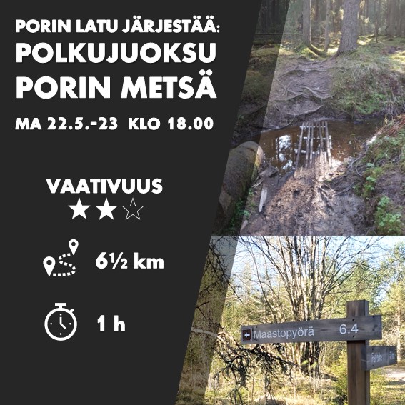 Porin Ladun polkujuoksu Porin Metsässä maanantaina 22. toukokuuta 2023. Kokoontuminen klo 18 Katinkurun polun päässä, tennishallin vieressä. Juostaan teknisesti vaihteleva maastopyörälenkki 6,4 km. Juurakkoisia ja mutaisia osuuksia luvassa sopivassa suhteessa. Ei ennakkoilmoittautumista, eikä osallistumismaksua.
