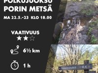 Lisätietoja Porin Ladun polkujuoksuohjaajalta: Eemeli Lappalainen p. 046 851 4010 ja Jarno Kuula p 040 7329065.