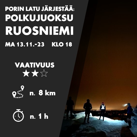 Lisätietoja Porin Ladun polkujuoksuohjaajilta: Eemeli Lappalainen p. 046 851 4010 ja Jarno Kuula p. 040 732 9065.