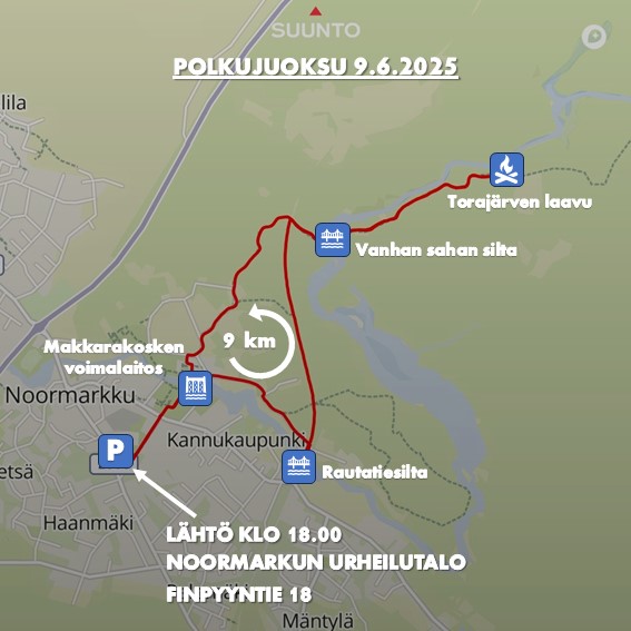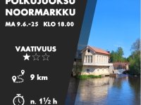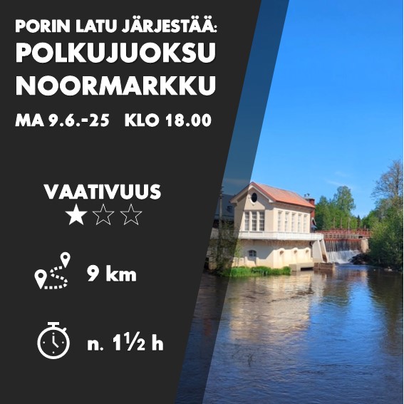 Porin Ladun polkujuoksu maanantaina 9. kesäkuuta 2025 Noormarkussa. Kokoontuminen klo 18 Noormarkun urheilutalon parkkipaikalla, Finpyyntie 18. Reitin pituus on 9 km ja maasto helpostijuostavaa metsäautotietä tai tasaista polkua. Juoksutahti rauhallinen ja pidetään normaalia enemmän hengähdys-/katselutaukoja.
