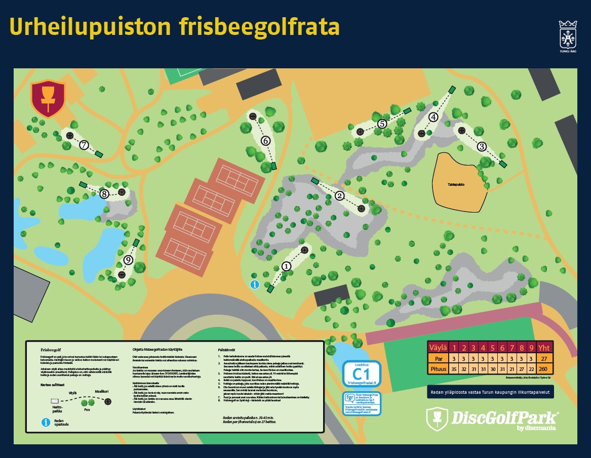 Turun Ladun Aloittelijafrisbee palaa juurilleen eli Urheilupuistoon. Lyhyet väylä, matkalla hieman kiipeilyä ja vähän vesistöäkin, pistetään vaan kiekko koriin.