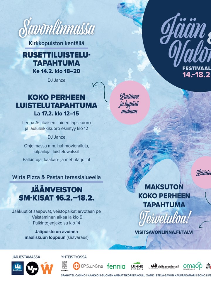 Tapahtuman avaus Rusettiluistelulla Kirkkopuiston kentällä 14.2 klo 18-20, Jäänveiston SM-kisa valmistelut 15-16.2 Ravintola Wirran terassialueella. Jäänveiston SM-kisa 17.2 klo 8.00 -20.00 ja 18.2 klo 8.00-14.00. Jäätaidenäyttely avoinna sen jälkeen maaliskuulle asti.