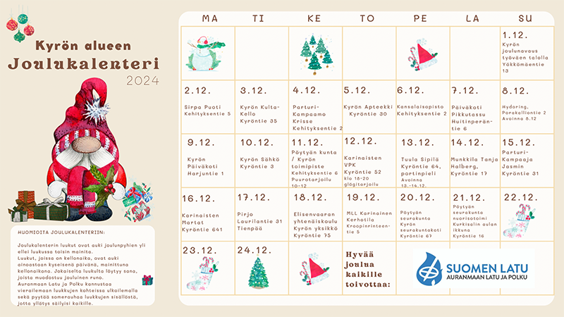 | Tapahtuman nimi | Kyrön alueen joulukalenteri |