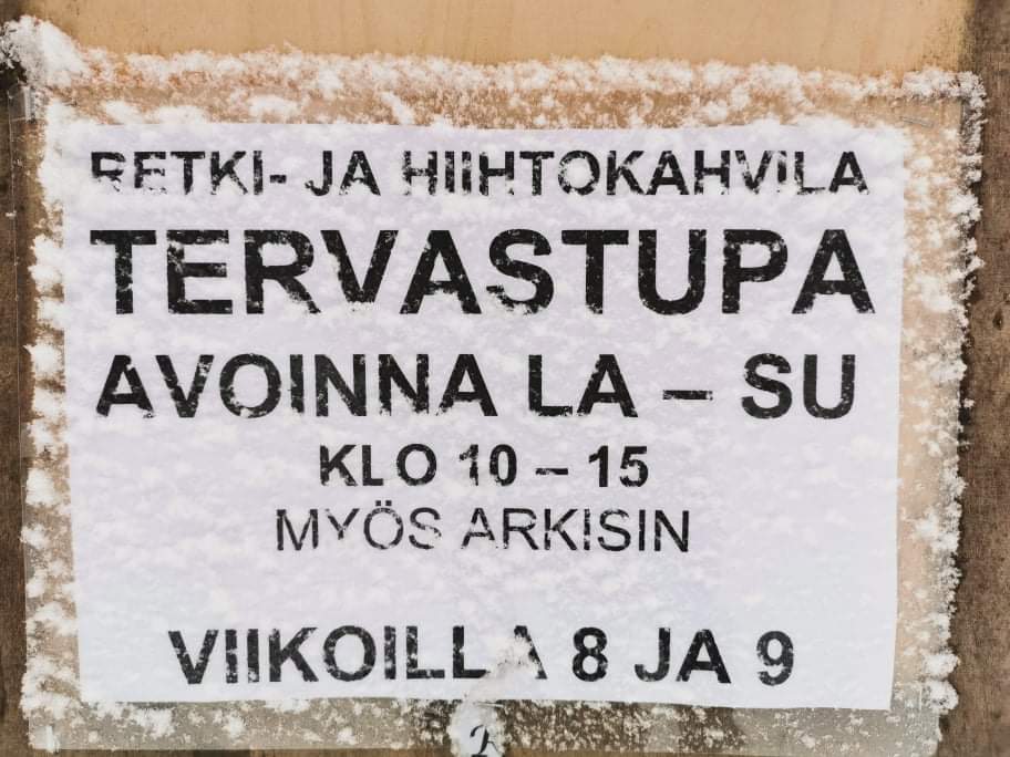 Latu- ja ulkoilukahvila Tervastupa palvele ulkolijoita hiihtokauden ajan lauantaisin ja sunnuntaisin klo 10-15, sekä hiihtolomaviikot 8 ja 9 päivittäin.