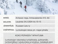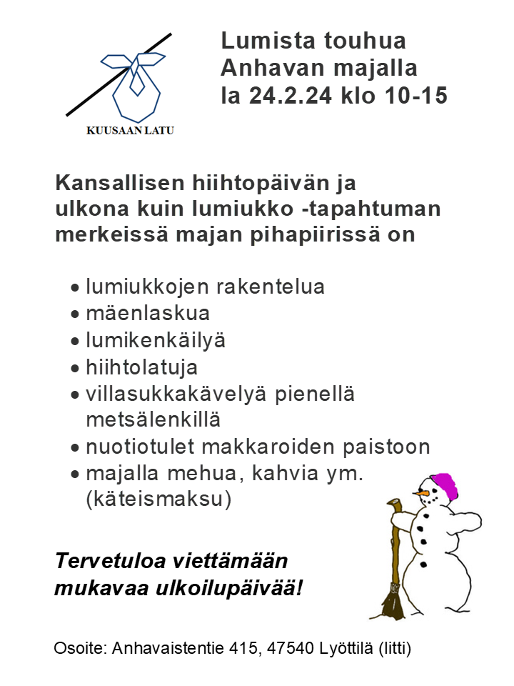Hei, Kuusaan Latu ry on 71v. ja toiminut pääasiallisesti Kuusankosken alueella. Anhavan latumaja sijaitsee Iitissä ja palvelee hiihtäjiä viikonloppuisin talvella ja hiihtolomilla koko viikon (säävaraus). Laturanta kesäpaikka sijaitsee Jaalassa Kaajärven rannalla ja on kesäisin jäsenistön käytösssä pientä päiväkorvausta vastaan. Maksut Laturannan sivuilla. Tervetuloa meidän yhdistykseen. Ota yhteyttä, jos olet halukas vapaaehtoistoimintaamme. Lisää aktiivijäseniä kaivataam.