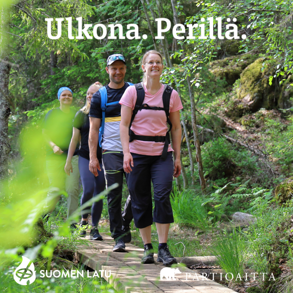 Kävelemme, sauvakävelemme metsän halki. Tapahtuman teema on kävly. Perillä. Iltanuotio.