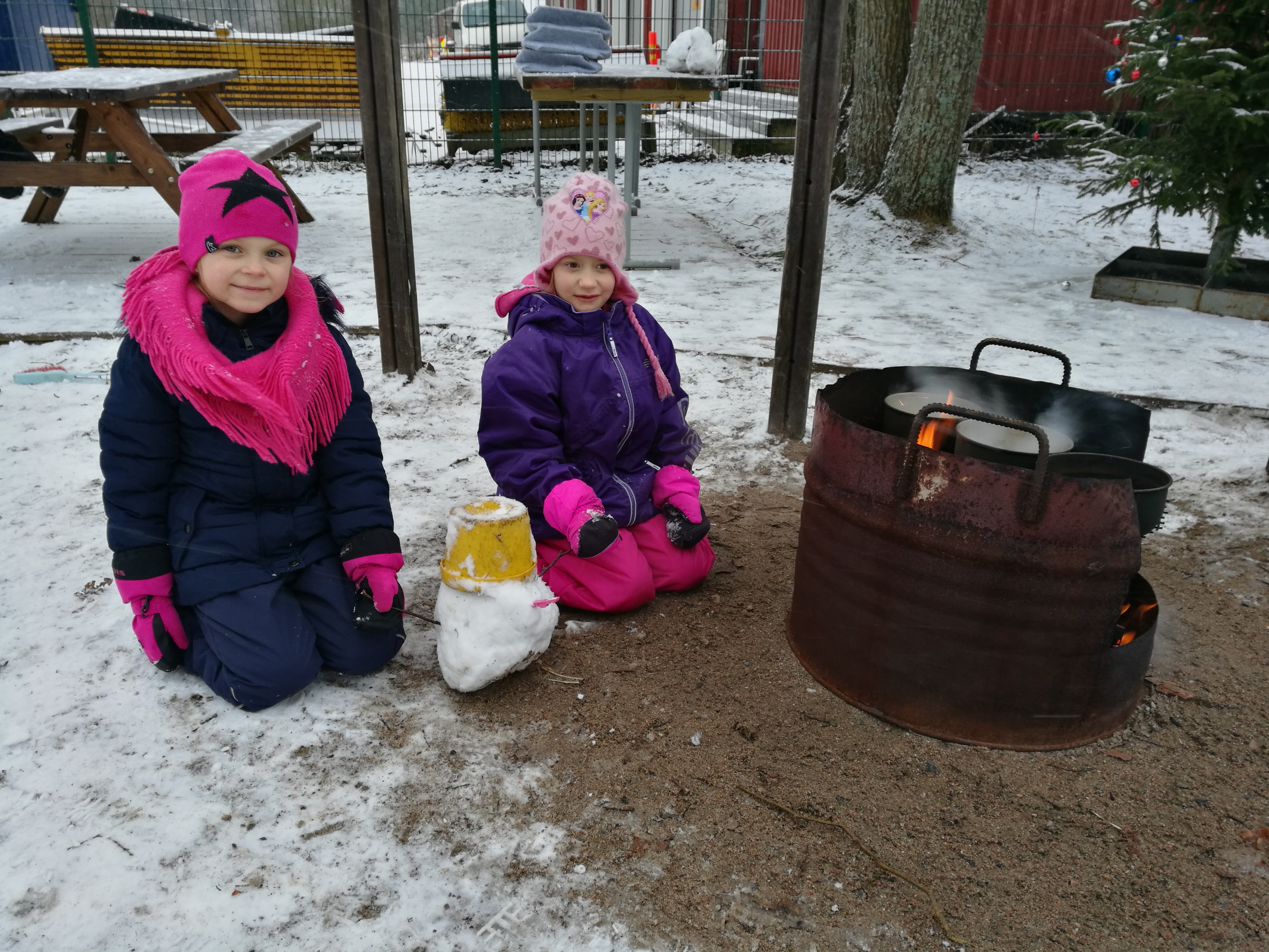 Tärkeää oli myös oman lumitaideteoksen ikuistaminen valokuvalla. Osa lapsista halusi olla itse valokuvassa mukana. Näin lapset saivat myös kokea, että he ovat tärkeitä ja se mitä he tekevät on merkityksellistä. Rakennuspuuhien ja vapaan leikin jälkeen maistui kuppi kuumaa lumiukkosoppaa, vaahtokarkein ja piparminttukepein maustettua kaakaota, joka oli valmistettu nuotiolla. Lopuksi lumiukot halusivat vielä tietää, oliko meillä kivaa ja yhteen ääneen kaikki huusivat JOOOOO!!.