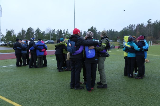 • Jaa parit, pienryhmät tai jonon järjestys uudella tavalla. Ehkä ryhmäläiset tutustuvat johonkuhun uuteen uuden parin tai järjestyksen kautta. Esimerkiksi Suomen Ladun ohjaajatapaamisessa muodostettiin ryhmät halausleikillä (kuvassa).