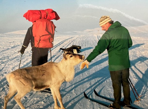 Kuvassa Risto hiihtämässä Kiilopään maastoissa, hiihtokaverina myös poro, joka seuraili hiihtäjien matkassa aikansa. Kuvaaja Tuomo Jantunen.