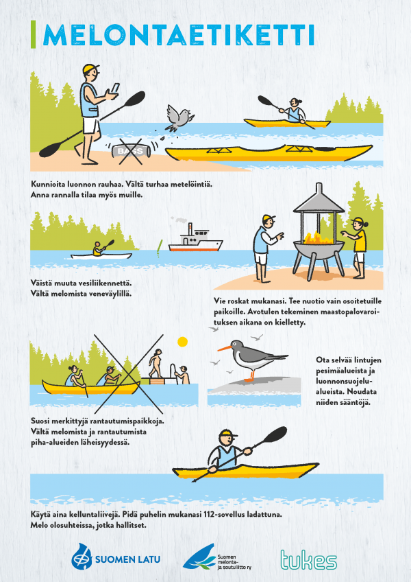 Suosi merkittyjä rantautumispaikkoja. Vältä melomista ja rantautumista piha-alueiden läheisyydessä.