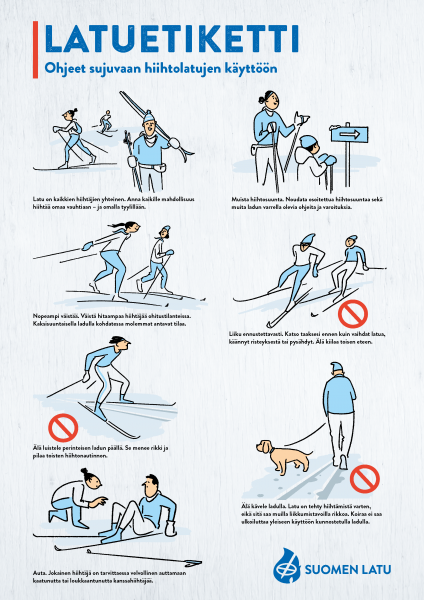 Laadimme myös ulkoilijoille ohjeen sujuvaan hiihtolatujen käyttöön. Tätä latuetikettiä noudattamalla kaikilla on mukavaa hiihtoharrastuksen parissa. Latuetikettitaulua saa vapaasti käyttää.